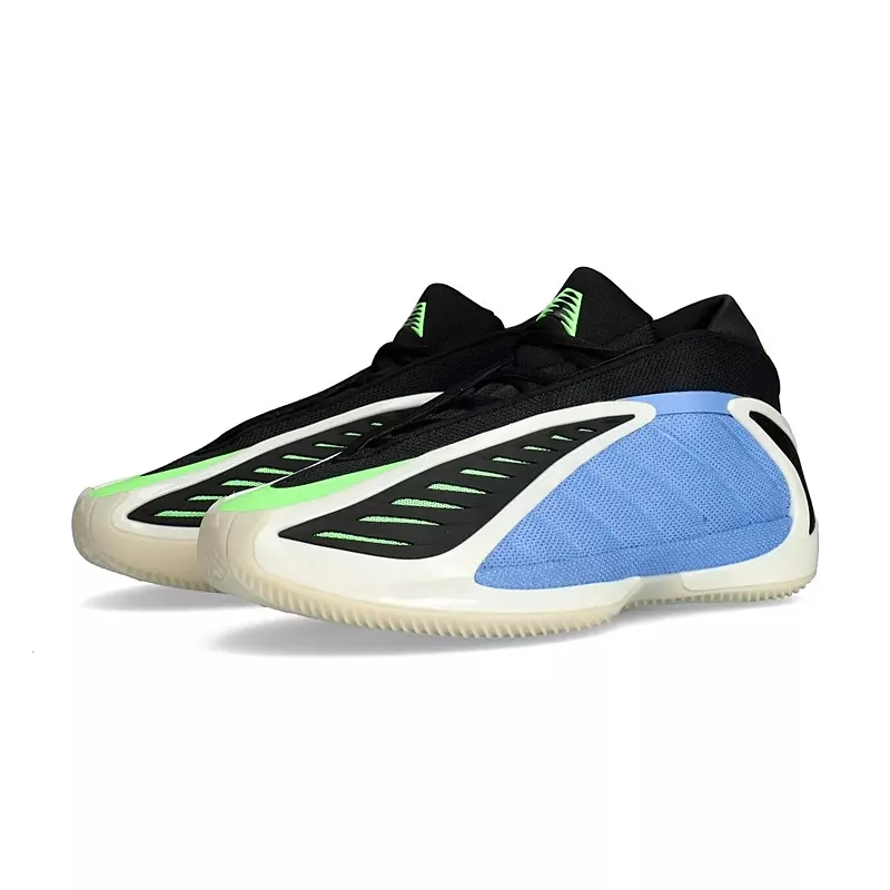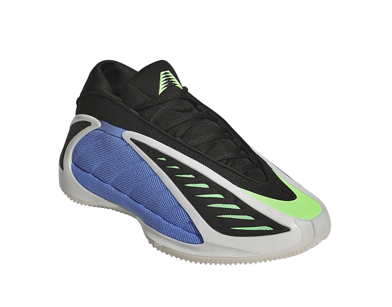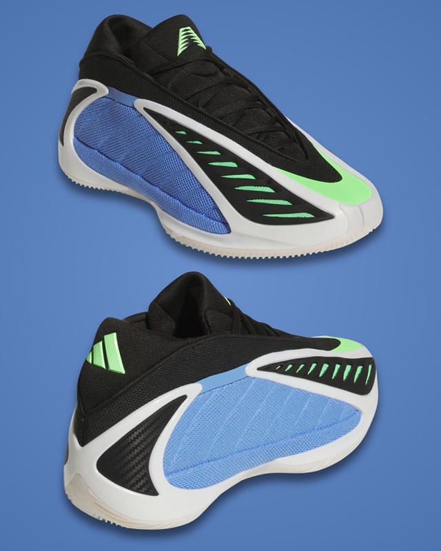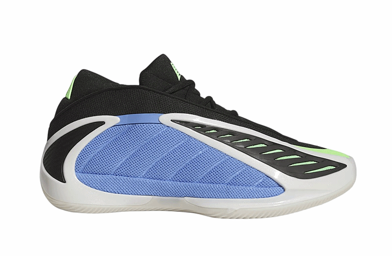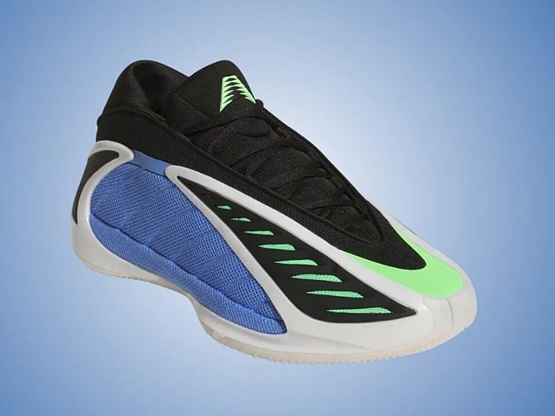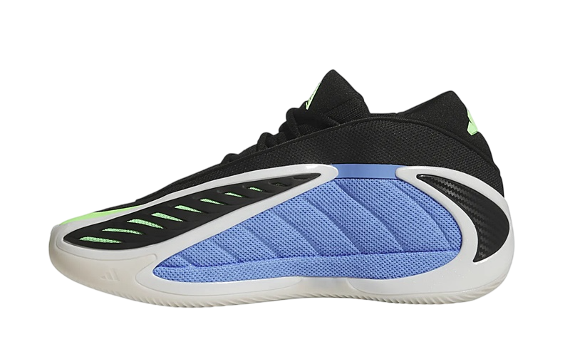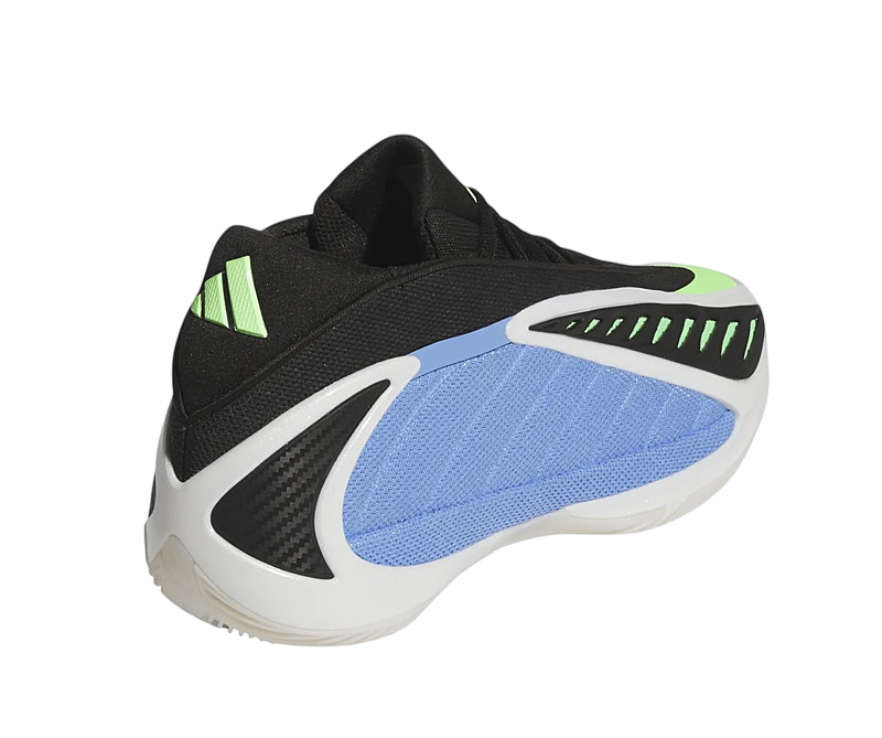 The design of the Adidas Anthony Edwards 2 is as distinctive as its functionality. The Fusion Blue, Zero Metallic, and Lime Blast color combinations make this pair stand out. The blue mesh on the panels and the green mesh under the black TPU layer not only add a striking visual touch but also improve foot ventilation thanks to the opening in the upper.