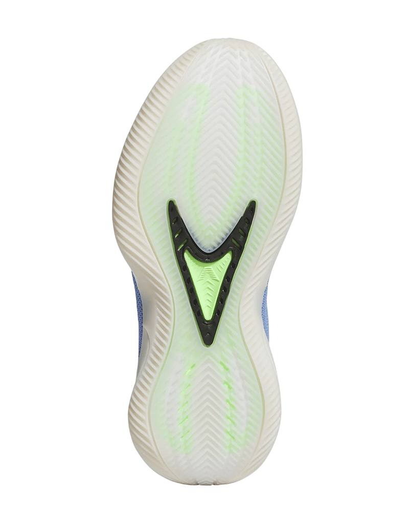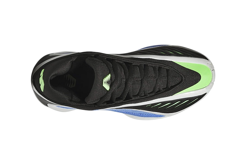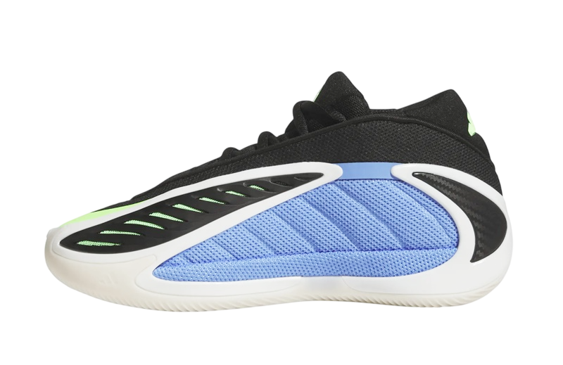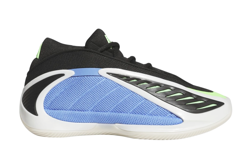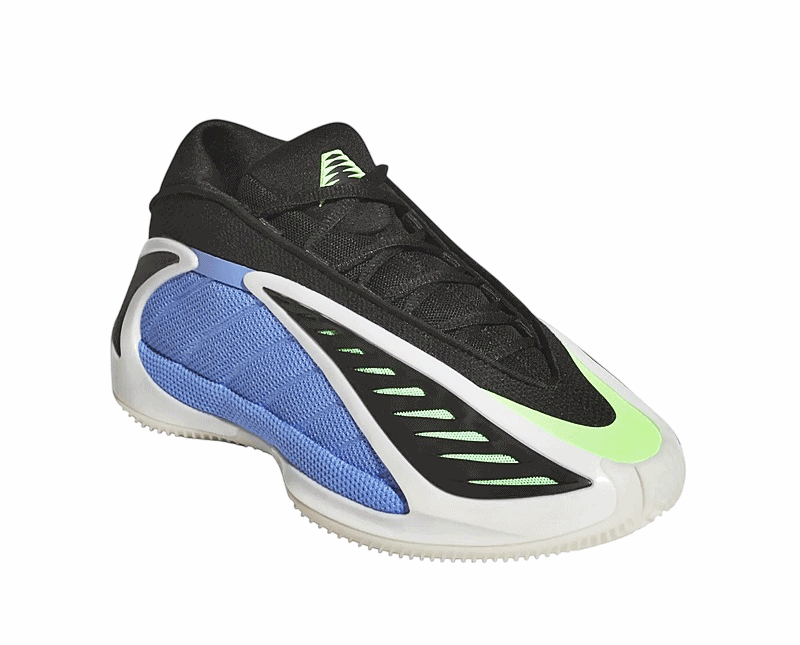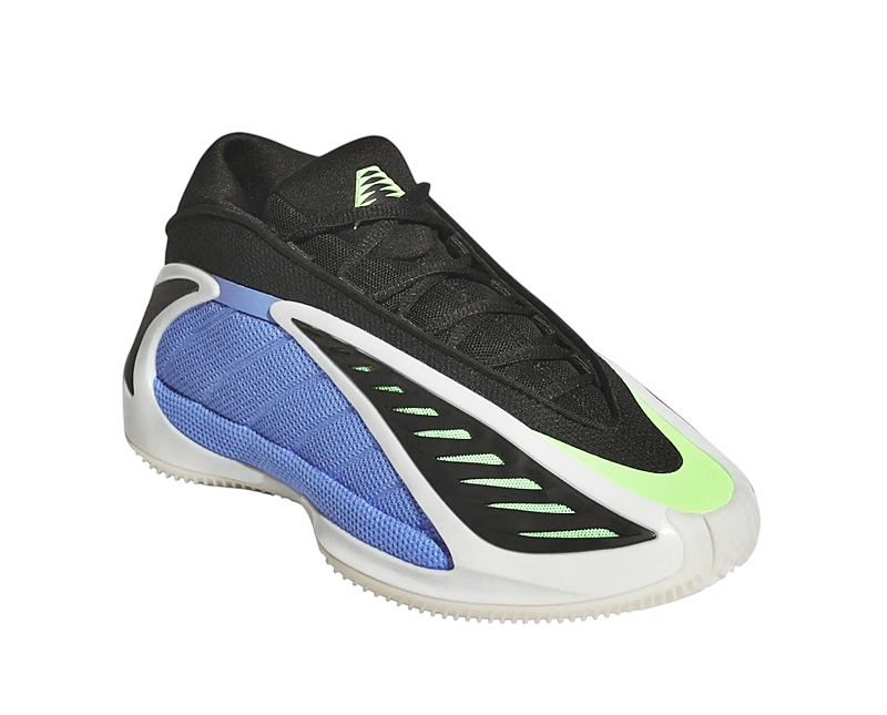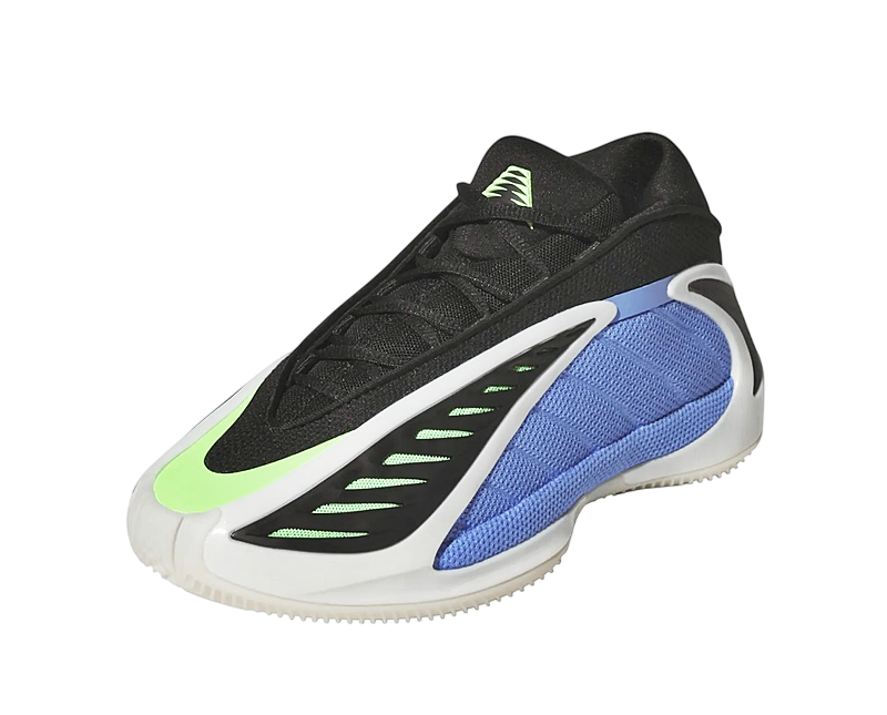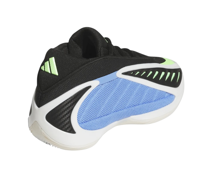The design of the Adidas Anthony Edwards 2 Junior is as distinctive as its functionality. The color combination of Blue Fusion, Zero Metallic, and Lime Blast makes this pair stand out. The blue mesh on the panels and the green mesh under the black TPU layer not only add a striking visual touch but also improve foot ventilation thanks to the opening in the upper.
