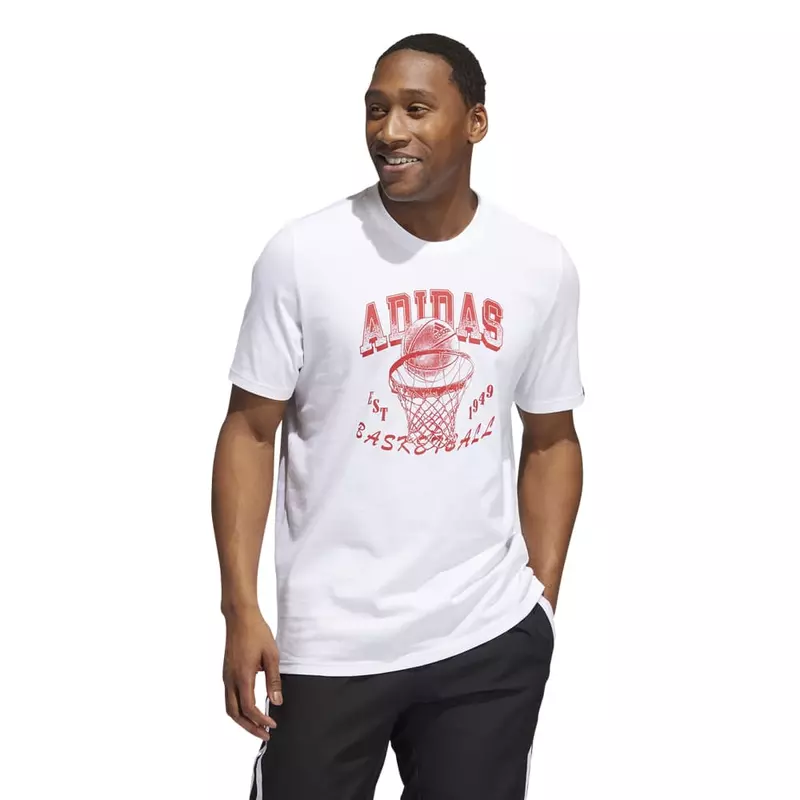 "Proclaim your passion for basketball. This adidas t-shirt features a screen-printed print of a ball and basket to let everyone know what your favorite sport is. It's made from soft cotton fabric to keep you comfortable at play or on the go. giving it all on the pitch.