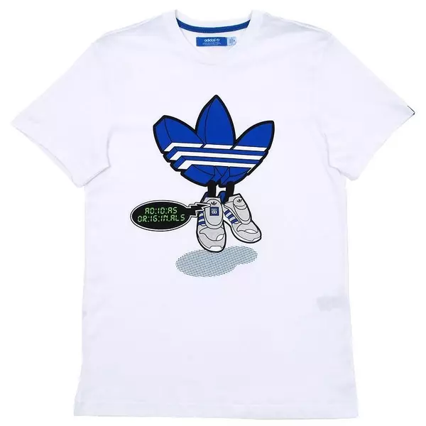 Camiseta de algodão premium com um projeto que comemora o Micropacer Adidas, um sapato que revolucionou a correr e treinador de coleta com o seu romance de micro-computador na língua.