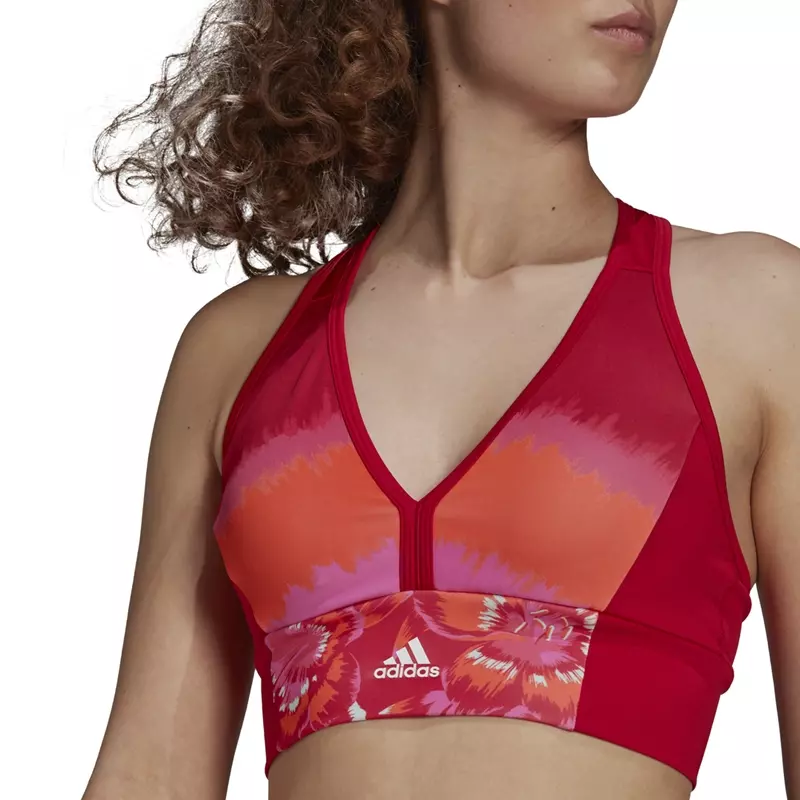 Don't worry about the insignificant things. But since sweat is inevitable when working hard, let this bra with breathable AEROREADY technology take care of keeping your skin dry. Focus only on the next rep. The sporty back design guarantees total freedom of movement. You can pair it with a t-shirt, but chances are you want everyone to see FARM Rio's vibrant floral print. We're sure. This product is made from Primegreen, a combination of high performance recycled materials.