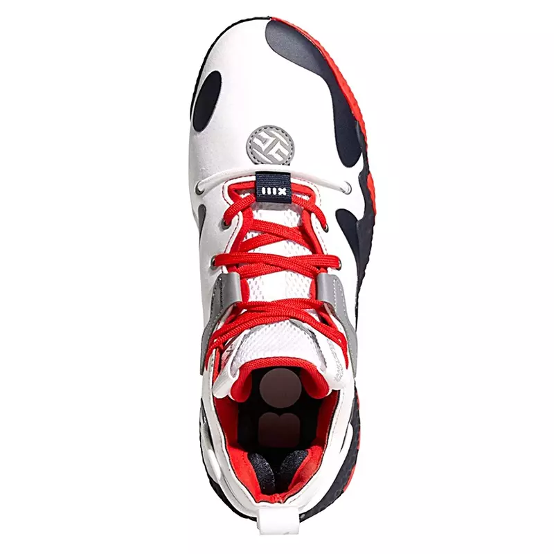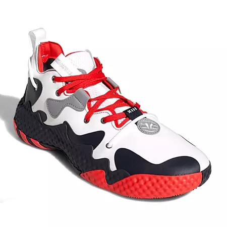 - This bold offering of the adidas Harden Vol. 6 features a mix-and-match color scheme of White, Navy, Red and Gold.