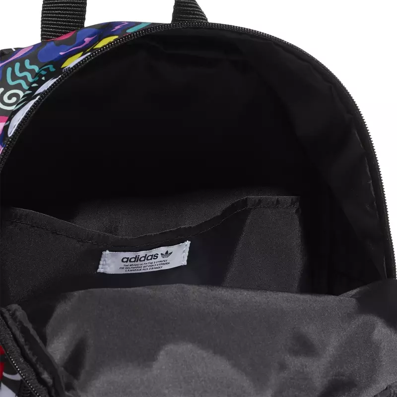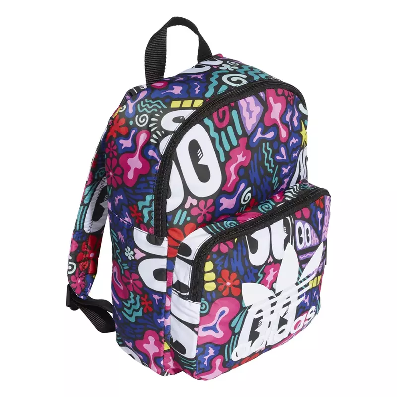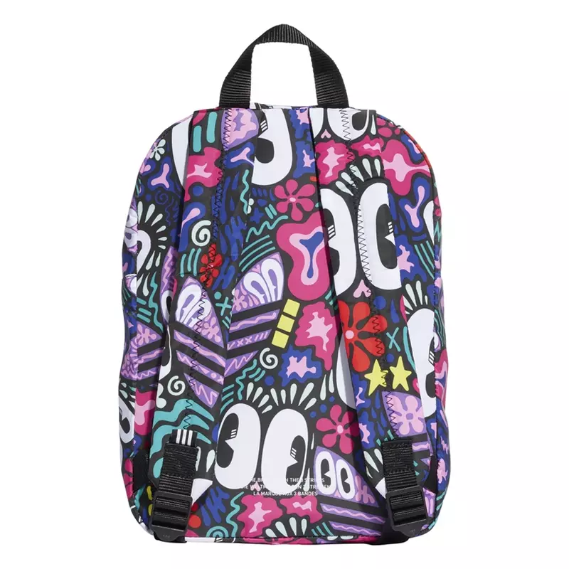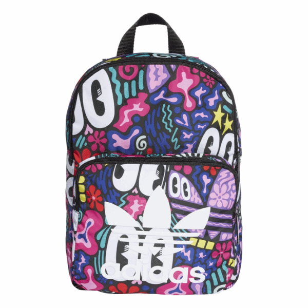 Fruit of the collaboration with artist Hattie Stewart, this backpack sports a colorful print with illustrations full of vitality and impudence. Its large main compartment includes a zippered front pocket for storing small items. The great contrasting trefoil completes this exclusive look.