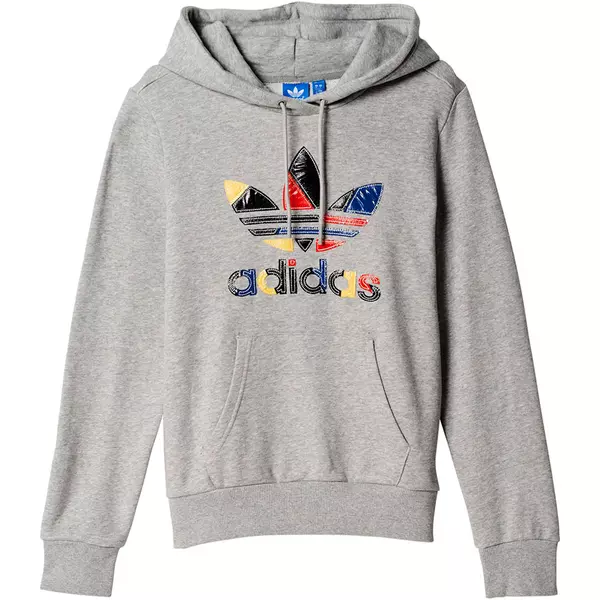 Diferentes telas cosidas elaborar un trébol de colores en la sudadera de mujer Adidas Originals. Hecho con acogedor felpa francesa, la sudadera con capucha tiene un cuello alto para el estilo fresco y un cordón con capucha jersey-alineada.