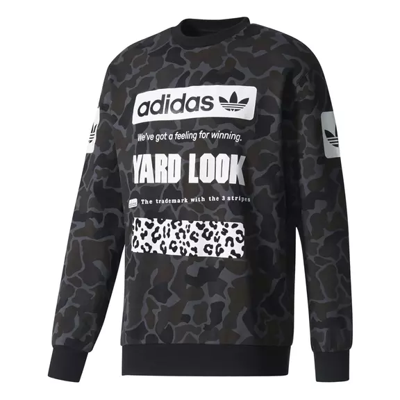 Blend into the cityscape in this men's crewneck sweatshirt. Rooted in adidas Originals style, the pullover features a linear Trefoil logo, printed badges, and an animal-print stripe across a tonal camouflage print. Trefoils on each sleeve let you show your adidas love.