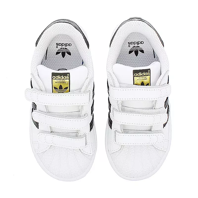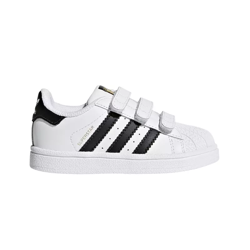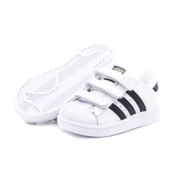 This shoe updates for the kids the legendary style of the adidas Superstar. It has a leather upper and a comfortable mesh lining, and has the classic rubber toe and 3 bands. Includes a closure with Velcro straps for easy insertion and removal.
