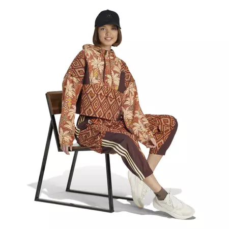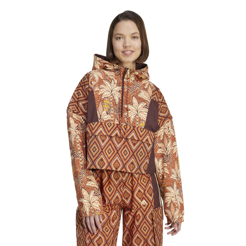 Move in style from the gym to the city in this adidas x FARM Rio track jacket. Inspired by patterns seen in the jungle, this loose-fitting jacket features a bold leopard print and vivid colours for a wild look. With a soft interlock fabric and a roomy hood to keep you comfortable, this track jacket lets you easily transition from your workout to a night out.