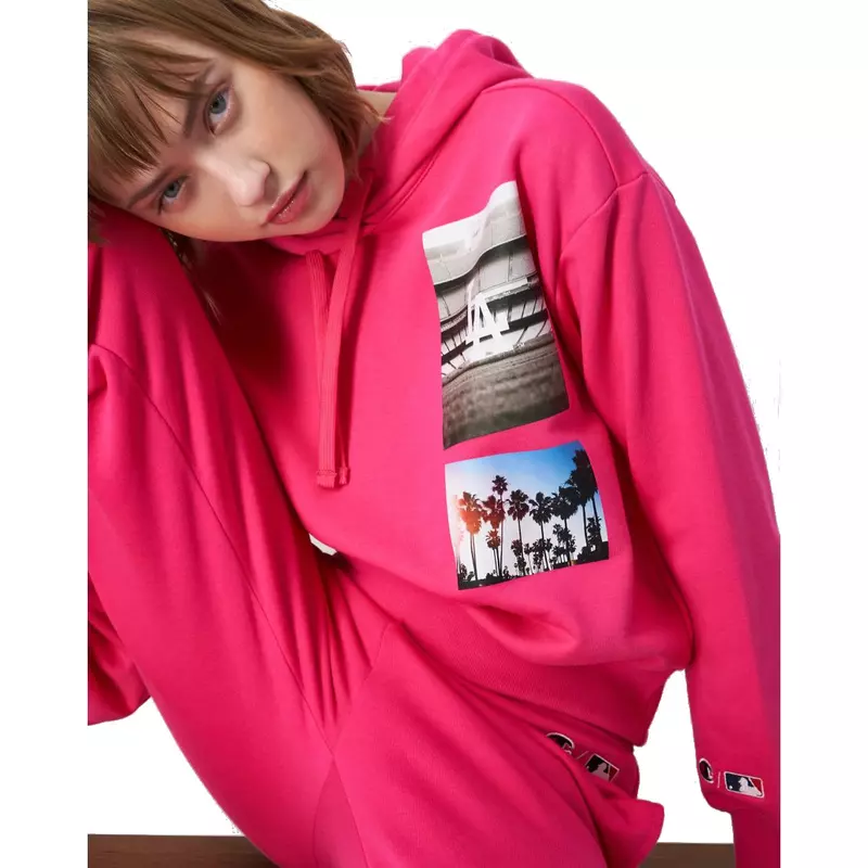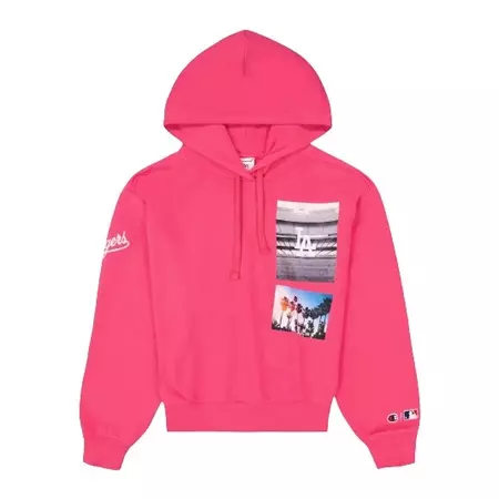 The Champion Hoodie Logo NY MLB Hoodie features a loose fit inspired by streetwear. Its fuchsia pink design is enhanced by a colorful print on the heart, the initials of Los Angeles illustrating the sunny landscape of the American west coast. "L.A" printed in color on the chest.