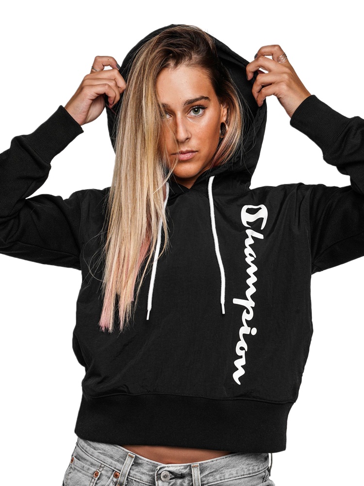 Champion Jack brand women's sweatshirt with carded interior. It's Custom Fit cut and it features a hood with adjustable drawstring. The length is trimmed and the edges are ribbed. It shows off the Champion logo printed on the front.