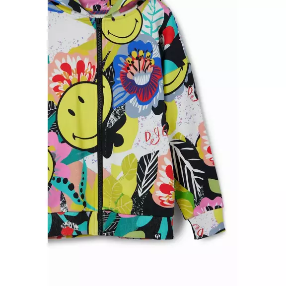 Oversized junior sweatshirt with hood, zipper closure and multicolor Smiley® print.