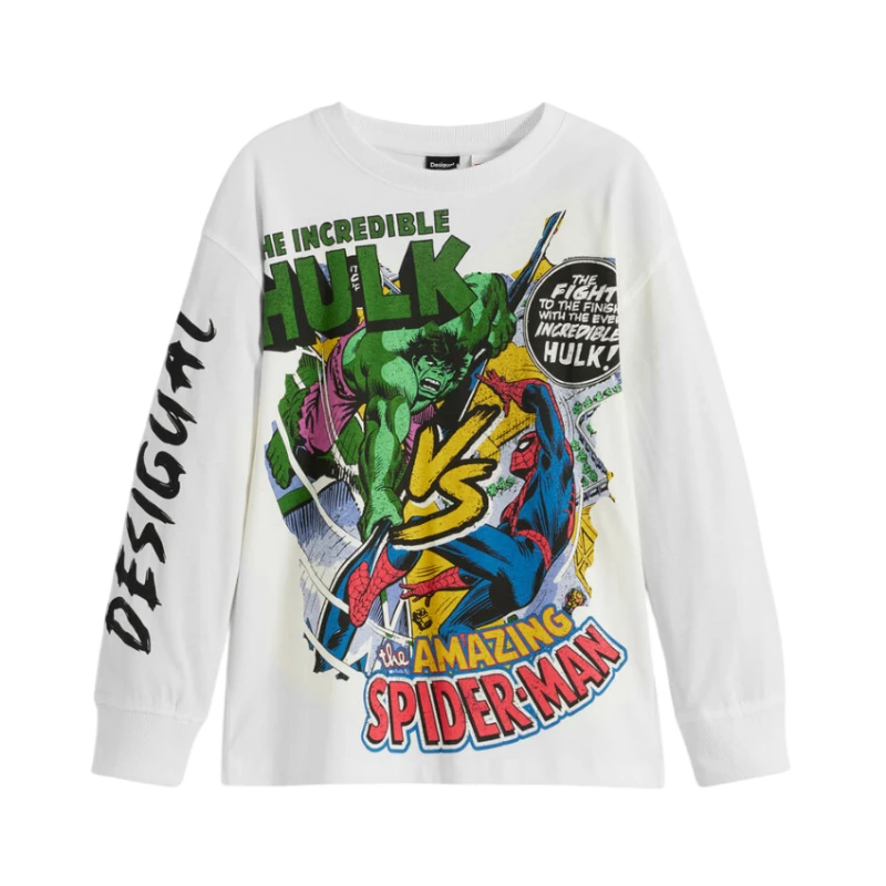 The Desigual Marvel™ Long Sleeve T-Shirt "White" is a unique and trendy wardrobe staple for fans of the iconic Marvel franchise. Featuring a crisp white background that makes the bold Marvel graphics pop, this T-shirt is designed for those who want to express their love for superheroes in style.