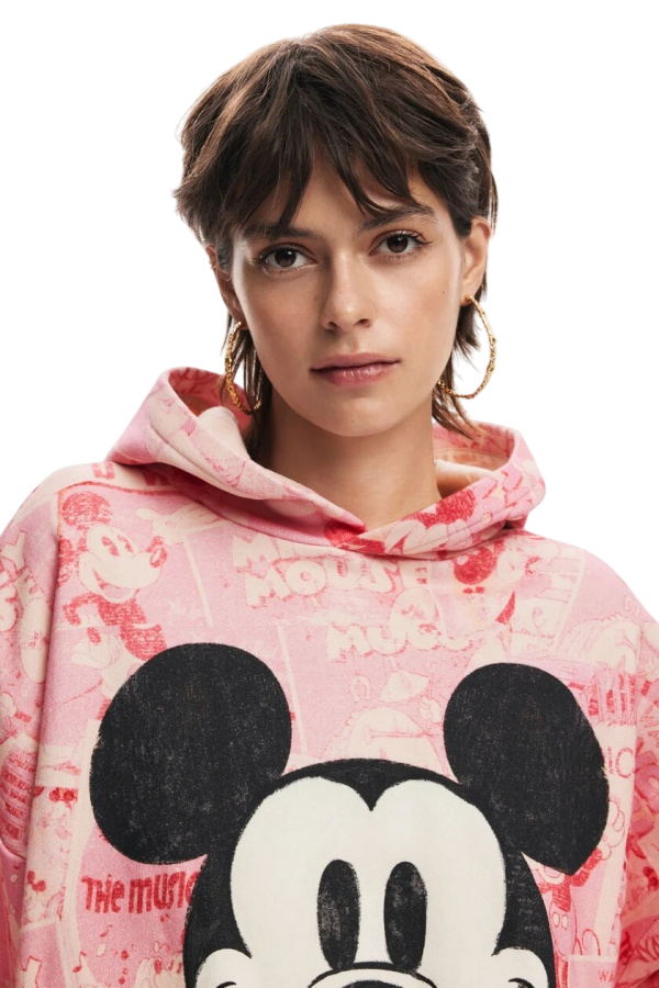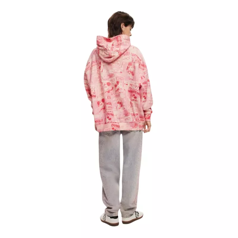 The Desigual Mickey Mouse Hoodie with Drawstring "Pink" is more than just a piece of clothing; it is a statement of style and comfort that combines the best of the iconic Disney character, Mickey Mouse, with a modern and attractive design. This sweatshirt stands out for its unmistakable print on a background of newspaper clippings, giving it a unique and artistic touch.