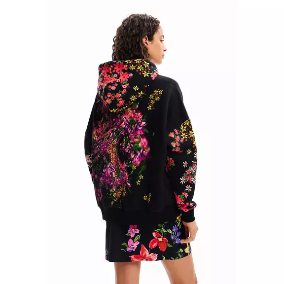 Oversized long-sleeved sweatshirt with hood and distorted flower print.