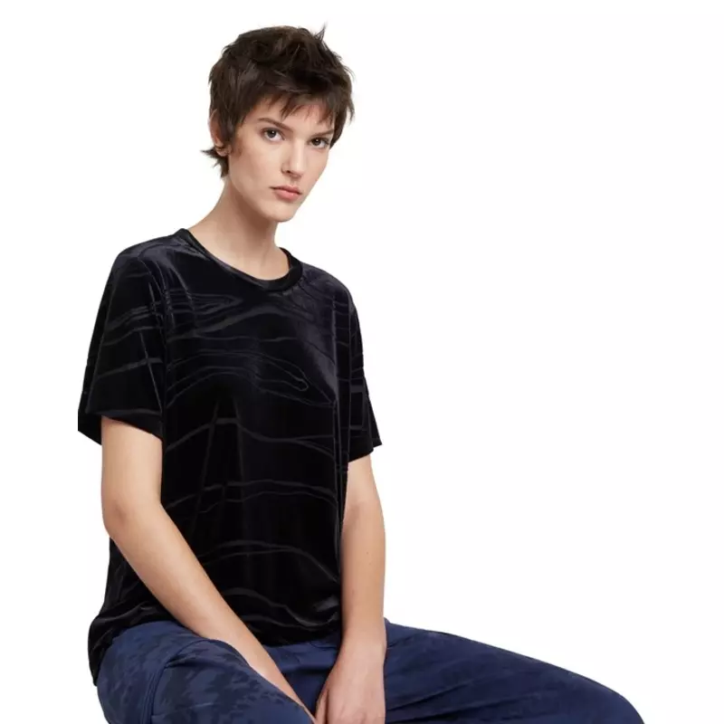 This short-sleeved round-neck T-shirt is not only comfortable thanks to its loose-fitting pattern, but is also especially elegant thanks to its velvety fabric with marbled veins in devoured effect of breathable mesh.