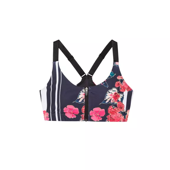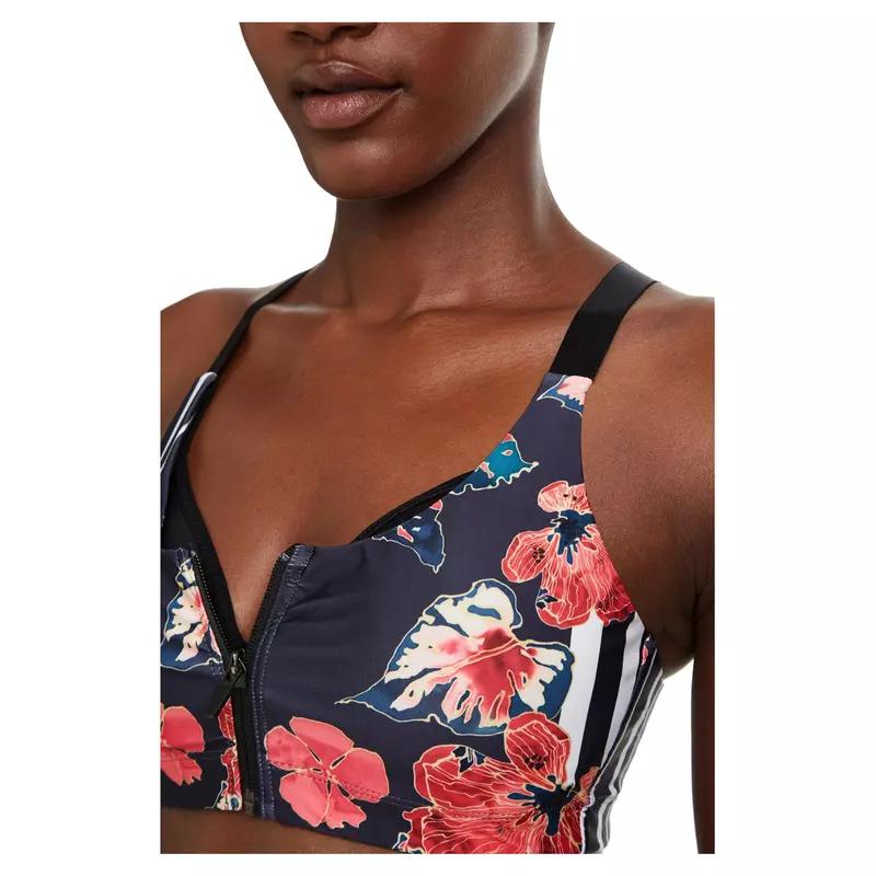 Playing sports is simply activating joy. Getting in shape is easy with the right clothes. We activate the energy of a scarlet floral red floral print on a dark background, combined with vertical stripes, in this women's tank top. Designed for impact sports, the cross strap across the back guarantees maximum support. The front and back zippers make it easier to put on and take off and make the pattern more flattering. The right garment and the right mood.