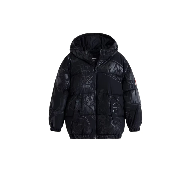 - Iconic Design: Embrace the unique fusion of Desigual's innovative style and Spiderman's legendary iconography. The jacket features striking Spiderman graphics against a sleek black background, made to capture attention wherever you go.