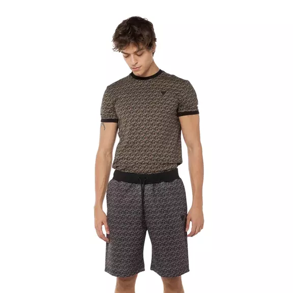 GUESS shorts in black, with a 3D printed logo all over the surface. Elastic waist with drawstrings. 2 side pockets on the front.