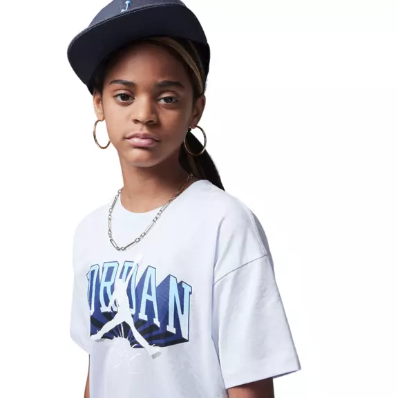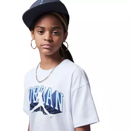 Experience the perfect blend of style, comfort, and functionality with the Jordan Girls JDB Push Through Graphic T-Shirt "Football Gray". Crafted for young girls who love to mix fashion with athletic prowess, this t-shirt is your go-to for any occasion, whether you're ruling the court or chilling at home.