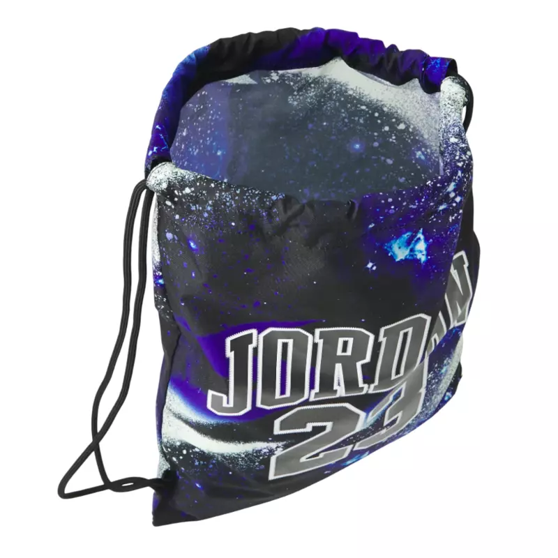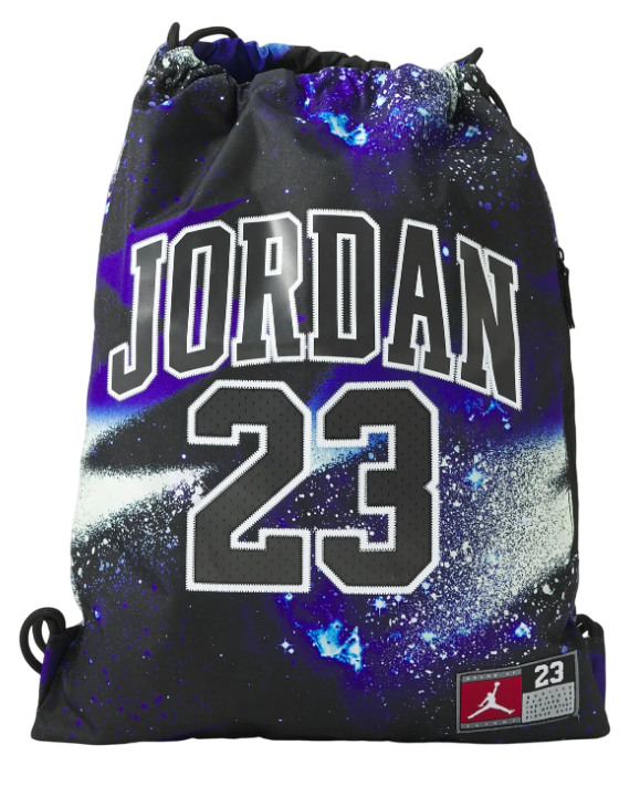 The Jordan gym bag features a contoured design that makes each design unique and lightweight. It features an open top so you can store your gear and go. The shoulder straps double as a drawstring to secure your belongings.