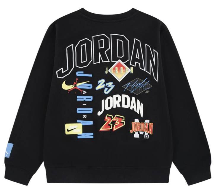 Show off your Jumpman Club status in this comfy crewneck sweatshirt, featuring bold graphics and a smooth cotton-blend fleece exterior and soft terry cloth interior. It boasts an embroidered Jumpman 23 logo, back prints from iconic Jordan Brand collections, dropped shoulders for a relaxed fit, and ribbed cuffs and hem for added warmth.