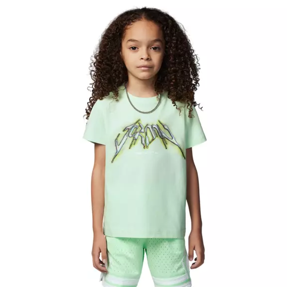 The "Vapor Green" is a vibrant and fresh color that turns any clothing collection into something special. This shade adds a touch of modernity while remaining true to the classic Jordan aesthetic. It features a striking graphic with the iconic Jumpman logo, making it a must-have piece for any young sports and fashion enthusiast.