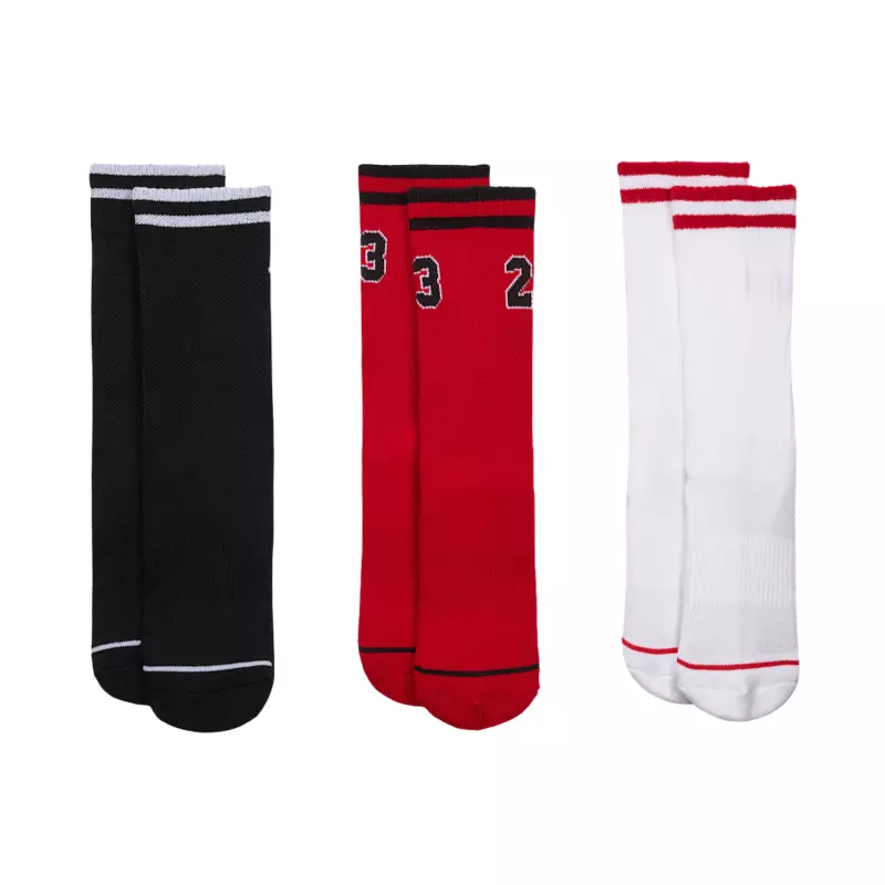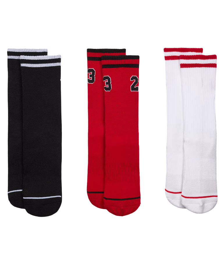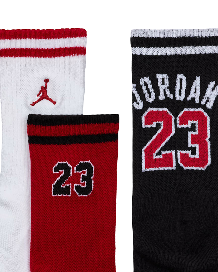 Introducing the Jordan Kids 3W-3PK Crew Socks in an iconic mix of White, Red, and Black. Designed specifically with kids in mind, these socks bring both comfort and style to the forefront of any wardrobe. With a breathable cotton blend, each pair provides exceptional softness and durability, ideal for the active lifestyle of children.