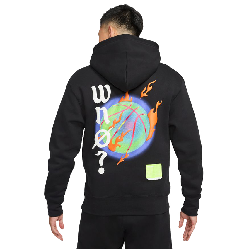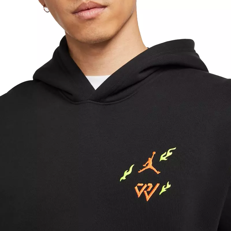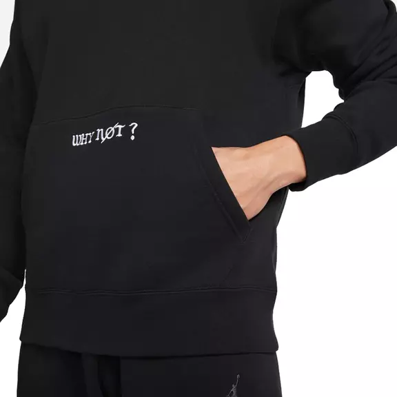 This garment is part of the Why Not? by Russell Westbrook from the Jordan franchise. It's made with a premium brushed fleece fabric and a loose, comfortable cut. The back features a large print with a fireball and the text "WNØ?", In addition to the Russell label. His logo is stacked with the Jumpman on the chest.