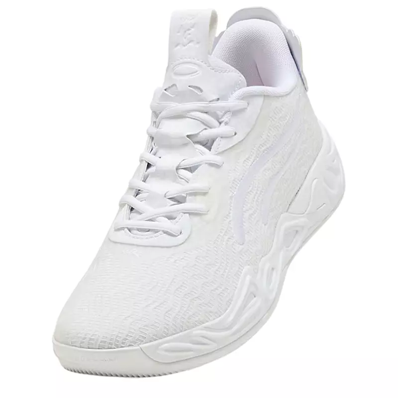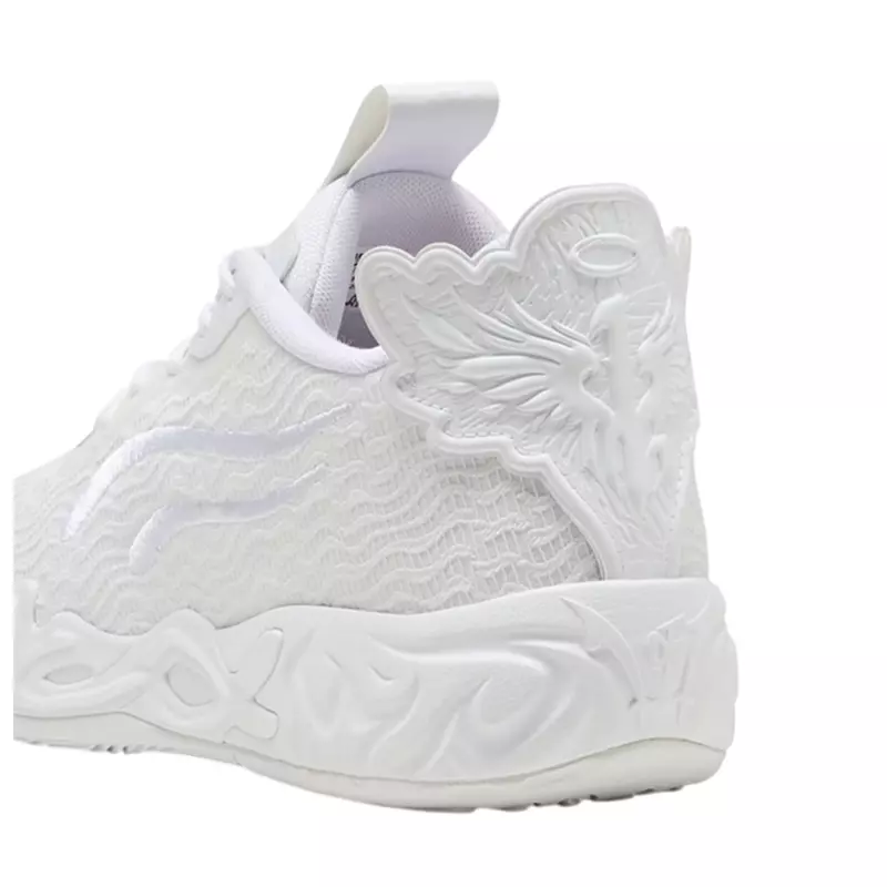 The MB.04 Low "Ice White" features a modern design inspired by sportswear. With a crisp white upper and unique iridescent details, these sneakers not only command attention but also reflect LaMelo Ball's bold, personal style. Each pair of MB.04 sneakers stands out with its distinctive heel branding, which varies by color, ensuring that the Ice White pair makes a fashionable statement on the court.