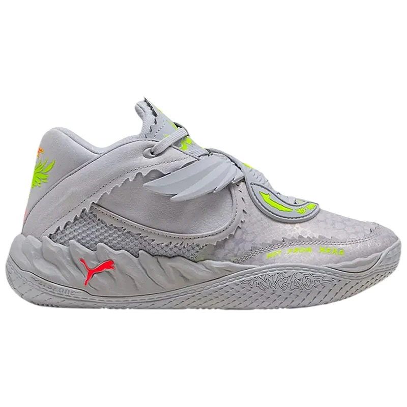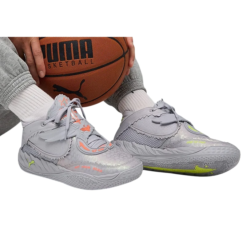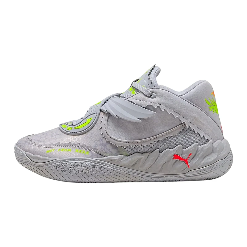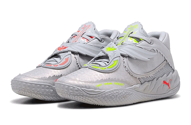 The PUMA MB.05 “Shine” is the latest iteration in the extraterrestrial collection inspired by LaMelo Ball. Using a metallic silver base with textured, reptile-skin-like overlays, the shoe plays with the "Not From Here" concept, fundamental since the MB.01 series. Its 3D winged strap that crosses the laces is a striking detail that truly makes these sneakers stand out, evoking the vibrancy and boldness of a comic book bubble.