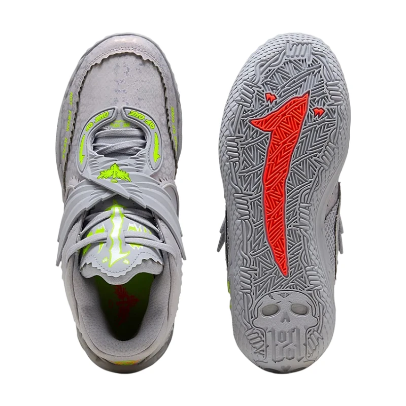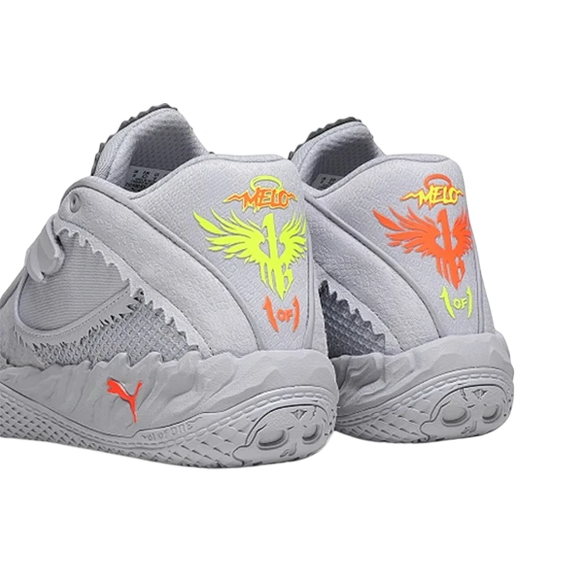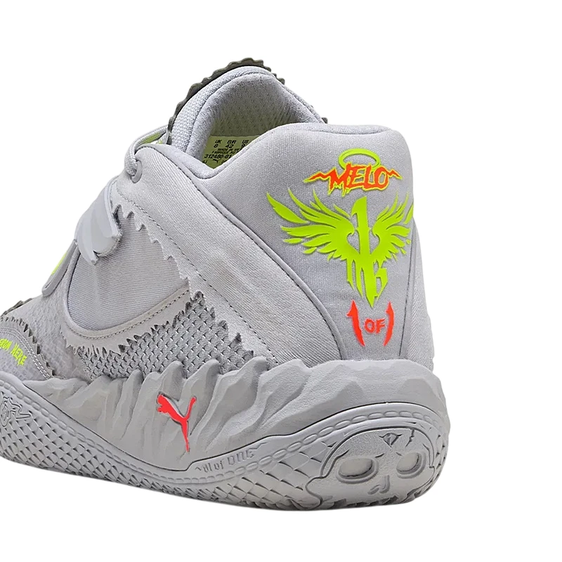 The left shoe breaks the monochromatic color scheme with its intense lime green accents, while the right shoe flashes with touches of orange. Inspired by Melo's bold style, this shoe features a striking chrome finish and signature iridescent details. Its upper consists of mesh with metallic overlays, while molded wings on the heel and a skull adorn the design, along with the "1" graphic on the outsole.