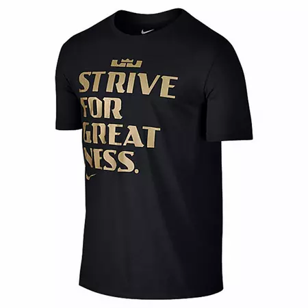 La camiseta para hombre LeBron "Strive For Greatness" contiene un gráfico directo sobre un tejido de algodón combinado que capilariza el sudor y ofrece un look de mucho orgullo y un ajuste cómodo.