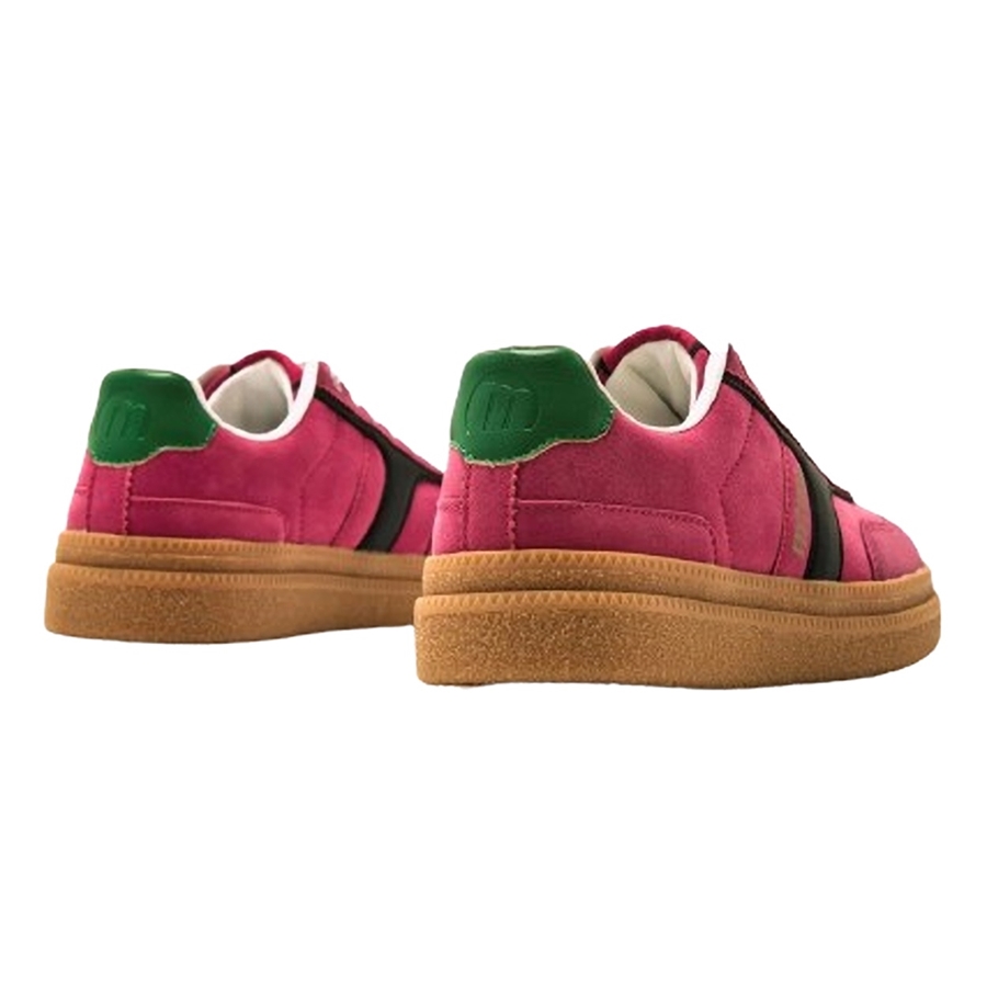 Cumbia Mustang sports shoe for girls, designed in fuchsia with different pink panels, white flat lace closure. Its back is green to give a touch of originality to the model, gold brand initials on the tongue and side of the shoe. Double-layer platform that gives you a few centimeters of height, with a caramel-colored sole. A trendy model that you can't miss this season.