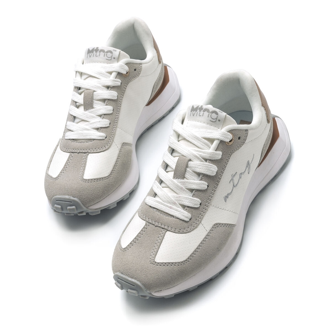 Zinc Mustang sneaker for women. Made in the classic white trainer shape, it features gray and bronze details. Flat lace closure. Brand name on the tongue and signature on the side. Toothed sole that goes up to the rear. panels with different textures. Your sporty chic looks take on a new meaning thanks to Zinc.