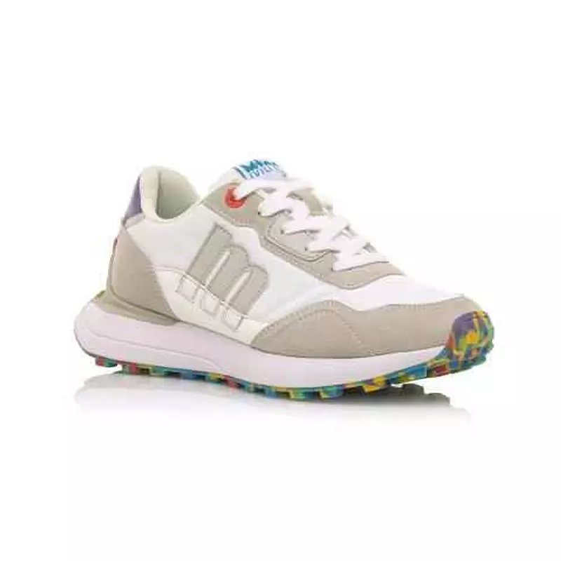 Zinc Mustang sneaker for women. Made in the classic white sneaker shape, it features gray and white details. Flat lace closure. Brand name on the tongue and signature on the side. Toothed sole that goes up to the rear. panels with different colors. Your sporty chic looks take on a new meaning thanks to Zinc.