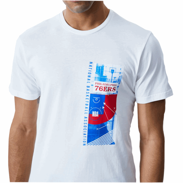 Enter the true New Era style and a Philly design featured in your daily wardrobe by picking up an official New Era Philadelphia 76ERS Photo Print short sleeve t-shirt. Rendered in white, blue and red, the shirt includes a photo printed on the left side of the chest. This engraving features a basketball court and is superimposed with a 76ERS text mark. A word mark separated from the NBA runs vertically on the print side. Our characteristic New Era flag is embroidered on the left sleeve.