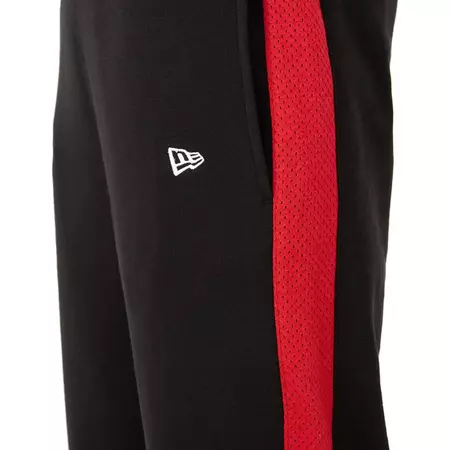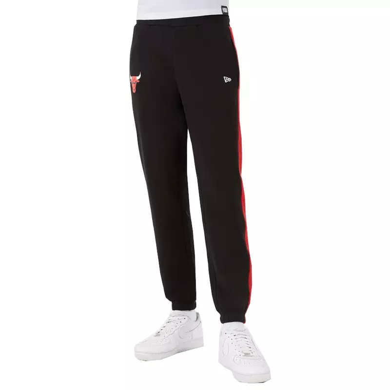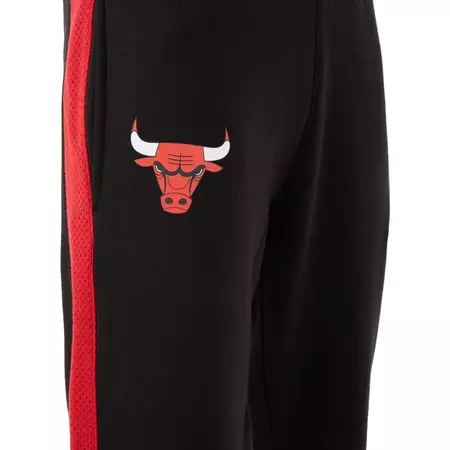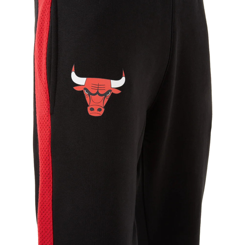 Enjoy a casual New Age design and iconic Bulls style with the official logo of the NBA New Era Chicago Bulls team, Black Jogger. Featuring a Bulls logo on the right leg and the NE flag on the left, the brushed fleece design is rendered in black and red. Additional details include red mesh inserts on the outside of the legs and a woven NBA bow label at the back of the waist.