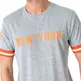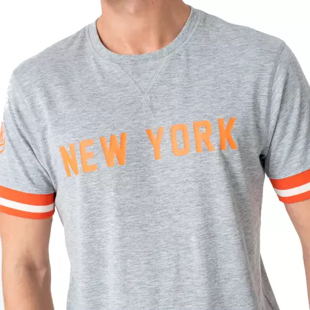 Support the city team with an official New Era New York Knicks NBA jersey. With an elegant design in heather gray, the shirt has stripes on the cuffs and is made with 100% lightweight cotton. The Knicks logo appears on the right sleeve, while the inscription "New York" is on the front of the design. Our historic New Era logo is embroidered on the left sleeve.