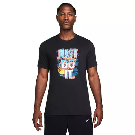 This Nike T-shirt with our iconic "Just Do It" print lets you show your passion for sports with vintage-inspired prints. Plus, it has a loose fit and is made with sweat-wicking fabric to keep you cool on the court and wherever you go.