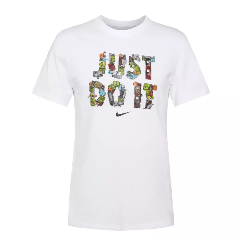The "Just Do It" T-shirt is always listed as one of Nike's favorite garments. This one from Nike Basketball spells out the timeless slogan in letters composed from a hodgepodge of images.