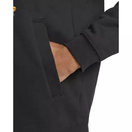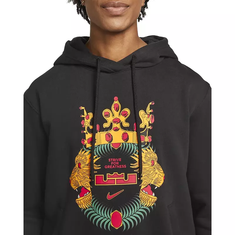 Step into the world of LeBron in his Nike Basketball Hoodie, a must-have for the winter months. This sweatshirt is made from a high-density brushed fleece fabric. Plus, it's fluffy, warm and light and offers a loose fit. The new illustrations depict LeBron's crowned lion logo as a flag emblem.