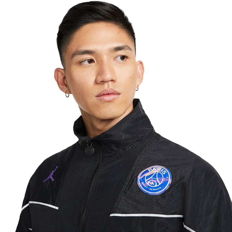 Everyone is on their feet in the Paris Saint-Germain Anthem Jacket, a fully lined zip-up jacket inspired by the club's fourth kit. It is made of a light woven fabric and with reflective details to match the iridescent club emblem.