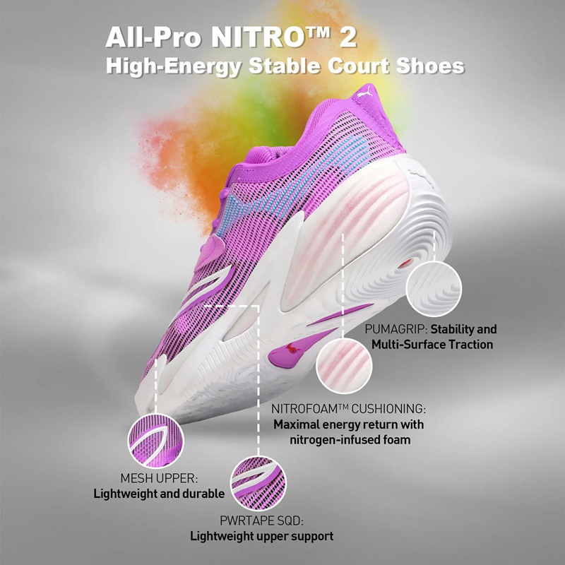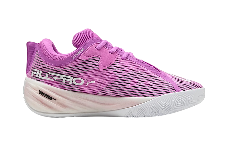 Discover the revolutionary Puma All-Pro Nitro™ 2 "Electric Orchid," high-performance basketball shoes designed to elevate your game with advanced PUMA Hoops technology.