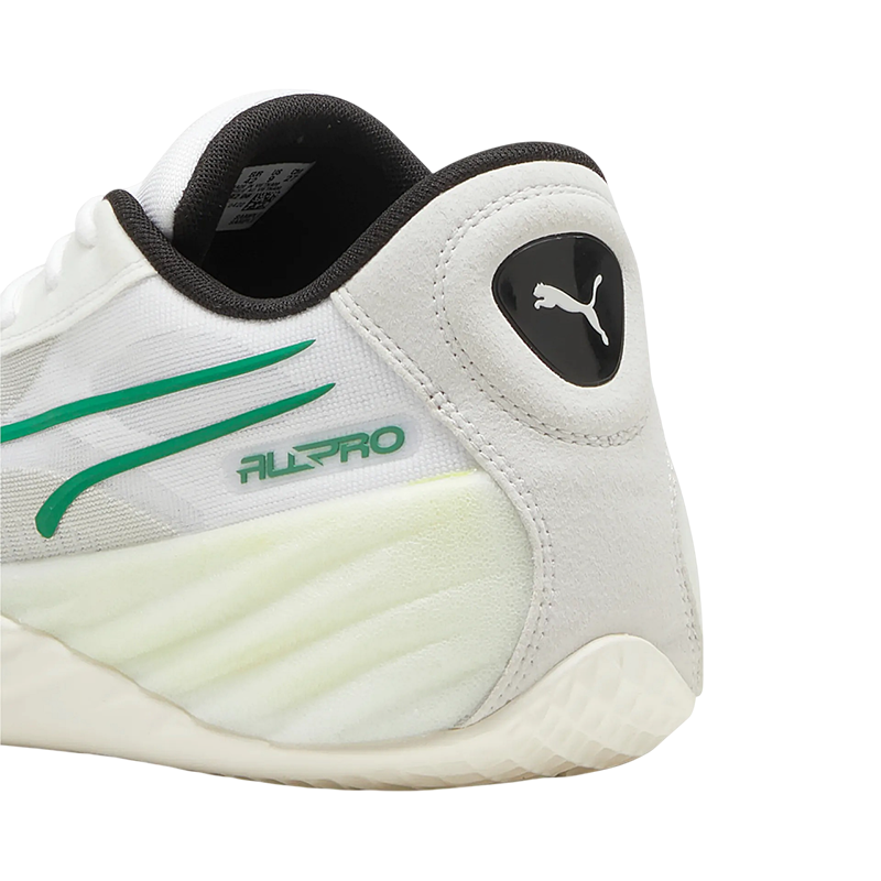 Especialmente indicados para a função de Base ou Guarda de Tiro, os Puma All Pro Nitro "Warm White Green" foram desenhados tendo em conta as necessidades dos jogadores que procuram velocidade e agilidade. Pesando apenas 380g (tamanho 9US), estes sapatos não só oferecem leveza, como também a capacidade de resposta que todos os jogadores procuram.