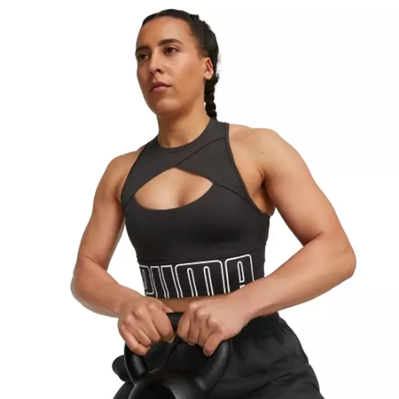 The PUMA FIT MOVE Longline Bra is an innovative design with a faux overlay, removable padding and a PUMA graphic. It features dryCELL material to wick away sweat and EVERSCULPT fabric with UltraForm to support and shape your body.