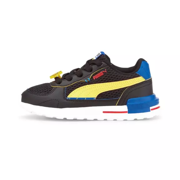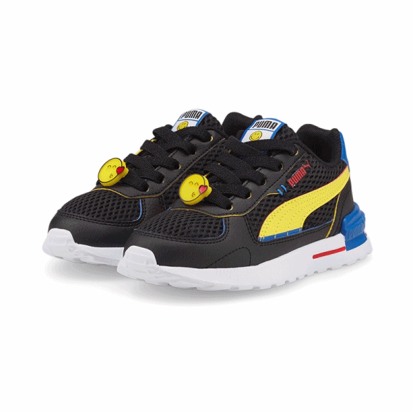Inspired by traditional running silhouettes but reworked for casual comfort, the SMILEYWORLD iteration of PUMA's classic Graviton puts fun into function. Focusing on emoticons as a universal language that allows children to learn and express themselves more deeply, this perfect pair is positive and fashionable. Featuring a bright and colorful design with a textile upper, synthetic overlays, and a grippy sole, these exciting kicks will have your child feeling great.