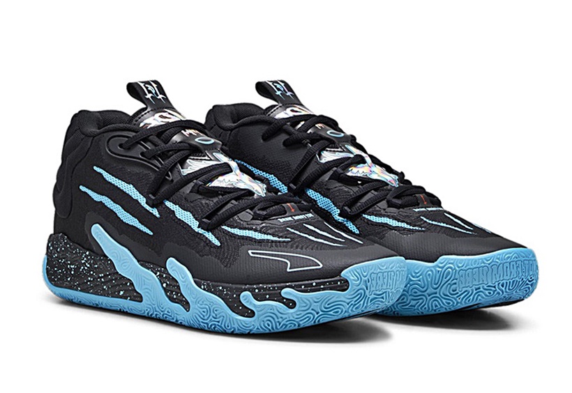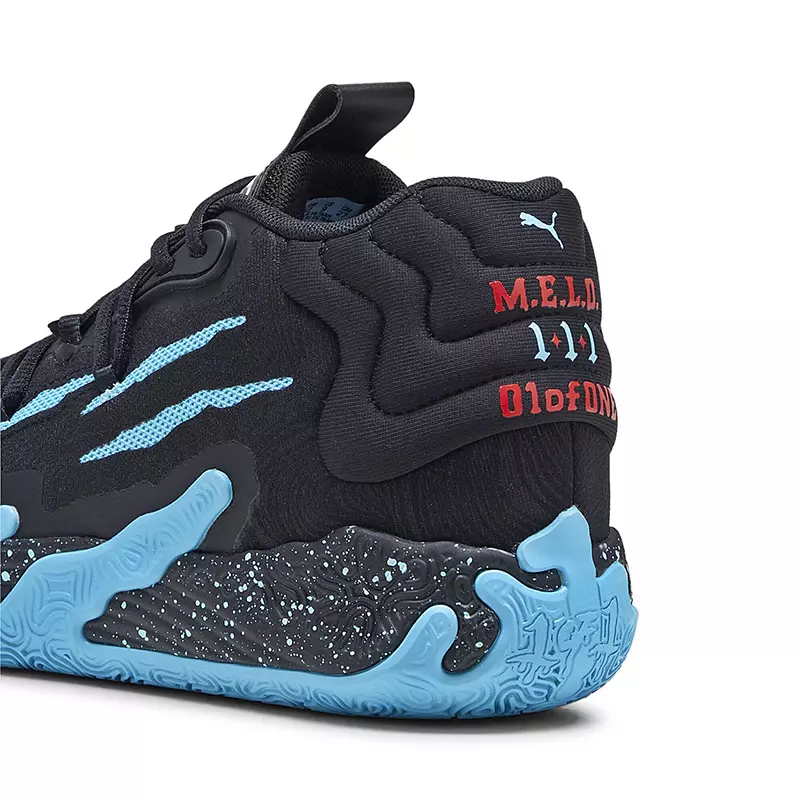 The MB.03, LaMelo Ball's third exclusive sneaker, takes us on a journey to an alternate universe never seen before: Melo's world. It stands out for its black and Blue-inspired rubber wrap layers and a scratched technical knit exterior; The MB3 is from another world. The blue sole and PUMA Hoops' space-age technology, including NITRO™ foam, give the tournament an interplanetary touch.
