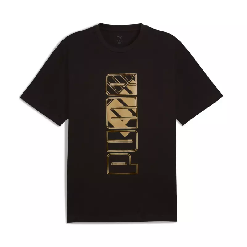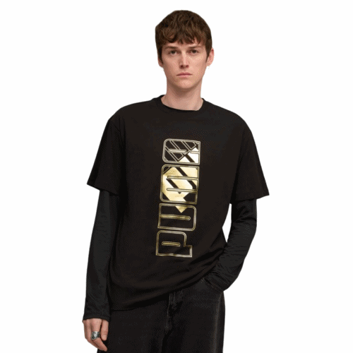The Puma MAXIMAL METALLIC Relaxed Tee "Black" is not just a shirt; it’s a statement of modern fashion with a sleek and contemporary design. Its unique metallic detail and relaxed fit make it a standout piece in any wardrobe.
