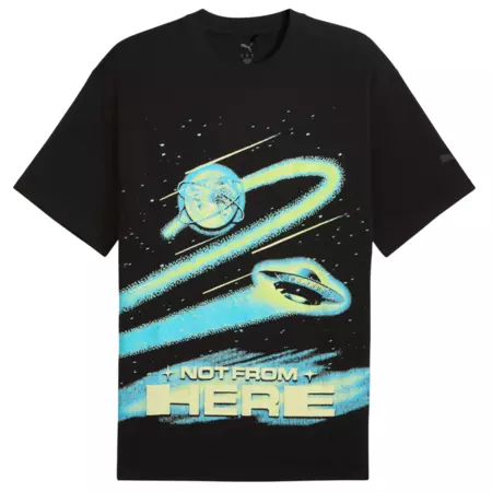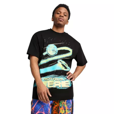 Perfect your everyday style with the Puma Melo Alien Skins Tee II "Black." This relaxed tee is more than just a piece of clothing; it's a style statement for those who love to stand out. Integrating the prestige of Puma Hoops and the unmistakable personal touch of basketball player LaMelo Ball, this tee infuses a natural, vibrant energy into any wardrobe. It not only has an eye-catching design but also focuses on sustainability and comfort.