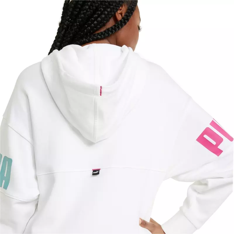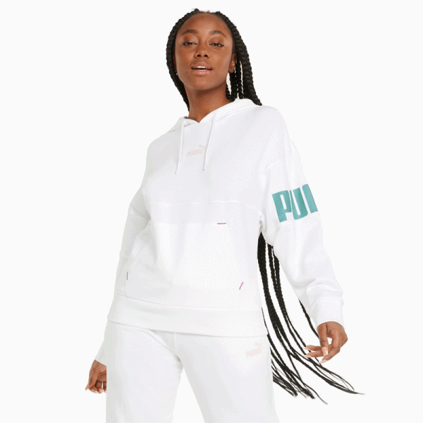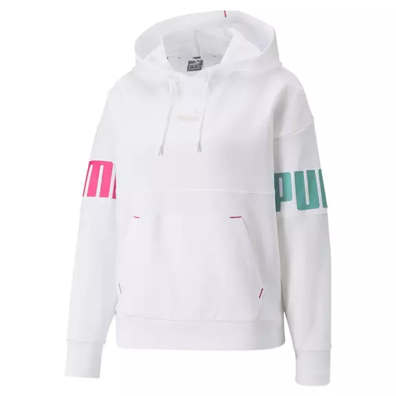 PUMA Power: A revolutionary sportswear line made for the streets. This piece puts a fresh spin on the classic hoodie with its relaxed fit, bold color blocking, contrast detailing on the front pocket seams, drawstring ends, and bold branding on the sleeves. .