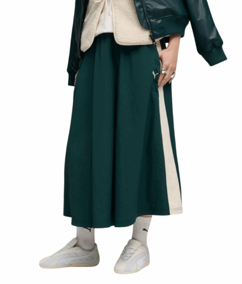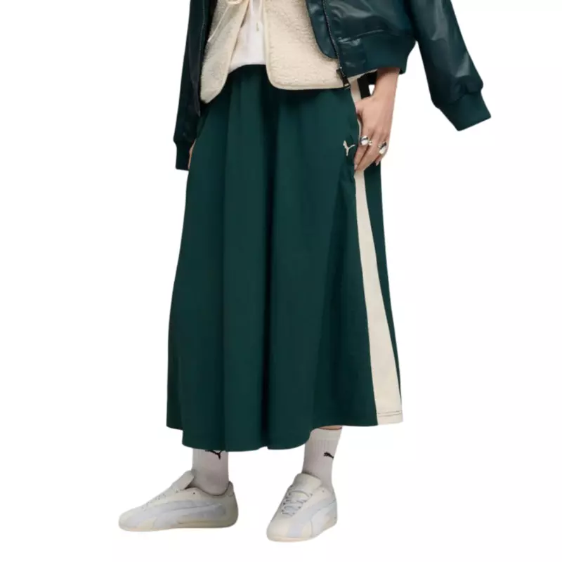 The midi length is perfect for showcasing a contemporary silhouette, sitting comfortably at mid-calf. The signature T7 panel inserts, synonymous with Puma's iconic design, run gracefully down the sides, providing a sleek, streamlined look that enhances mobility and aesthetic appeal.